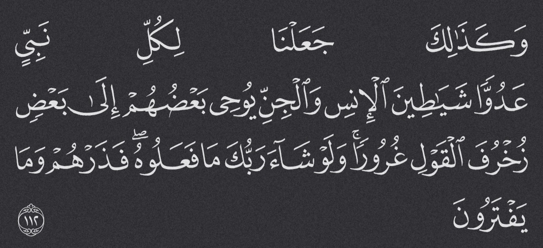 “And so We have made for every prophet enemies—devilish humans and jinn—whispering to one another with elegant words of deception. Had it been your Lord’s Will, they would not have done such a thing. So leave them and their deceit,”