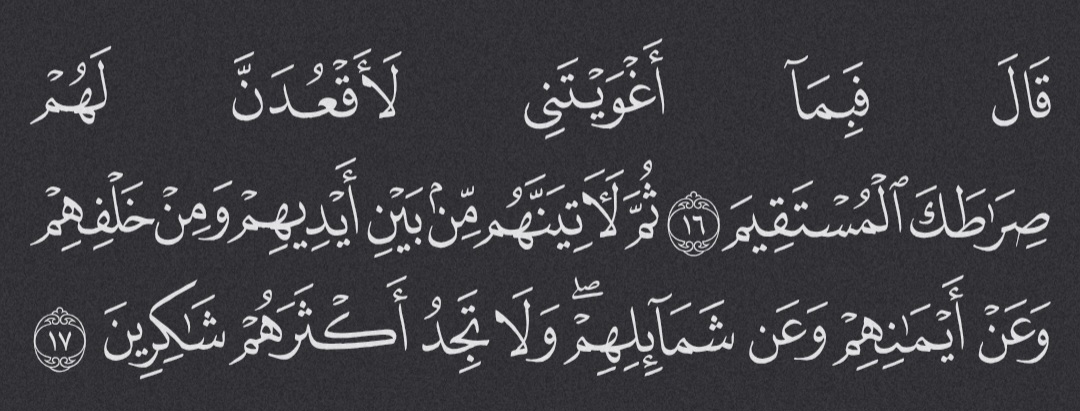 “He said, “For leaving me to stray I will lie in ambush for them on Your Straight Path.”