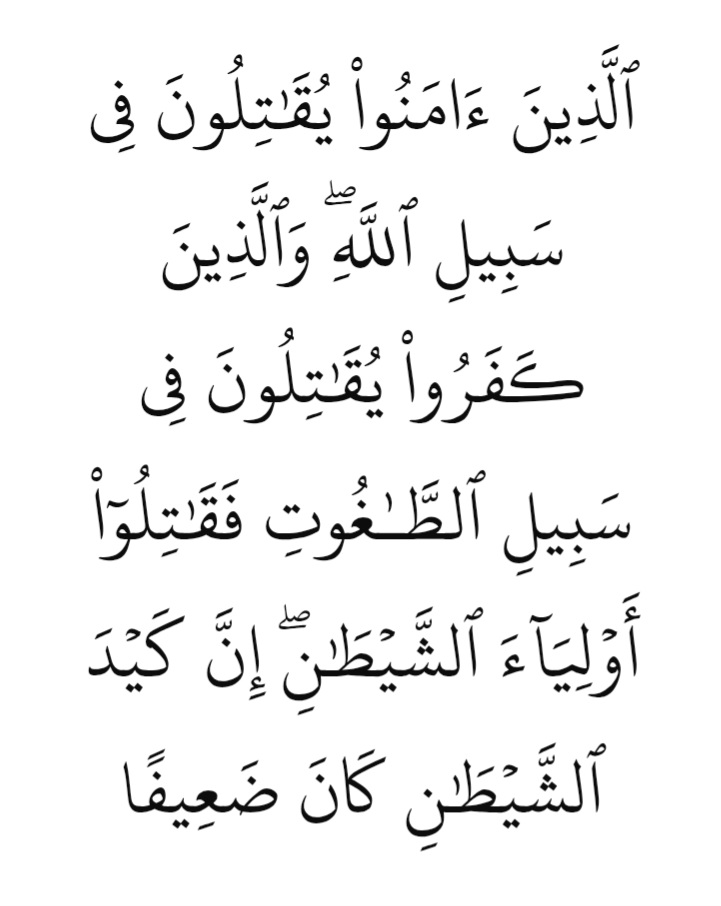 “Those who believe fight in the cause of Allah, and those who disbelieve fight in the cause of Taghut. So fight against the allies of Satan. Indeed, the plot of Satan has ever been weak.”7