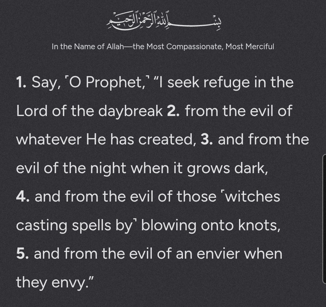 We seek refuge from the evil of knot blowers, enviers and the lurking whisperer.