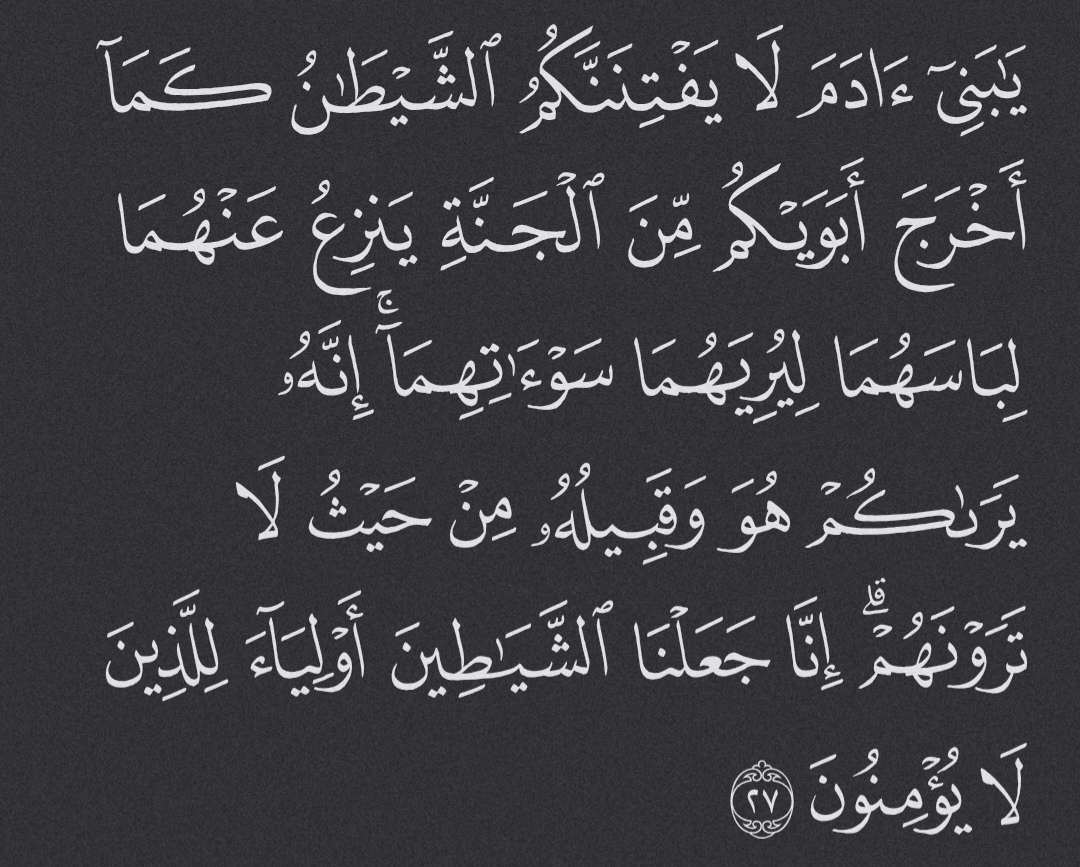 “O children of Adam! Do not let Satan deceive you as he tempted your parents out of Paradise and caused their cover to be removed in order to expose their nakedness. Surely he and his soldiers watch you from where you cannot see them. We have made the devils allies of those who disbelieve.”8