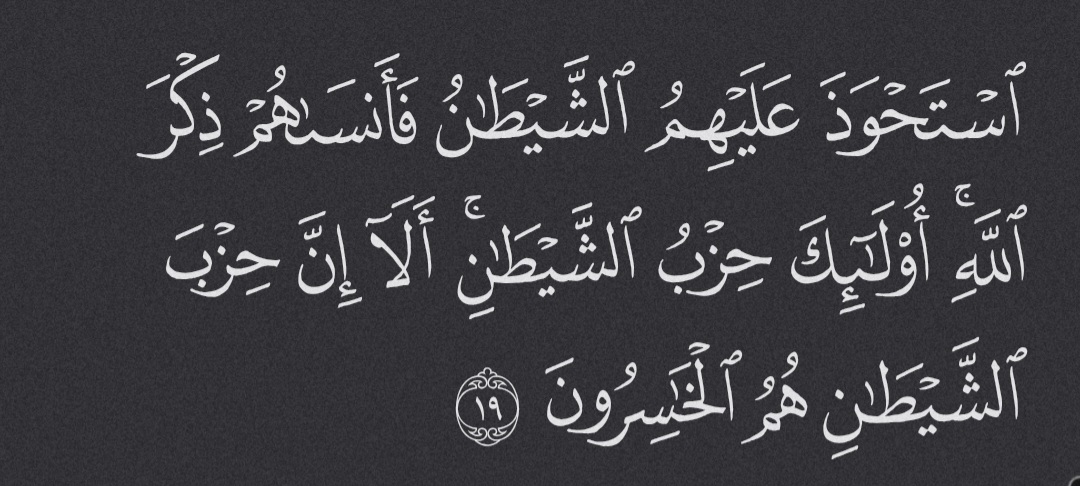 Satan has taken hold of them, causing them to forget the remembrance of Allah. They are the party of Satan. Surely Satan’s party is bound to lose.15