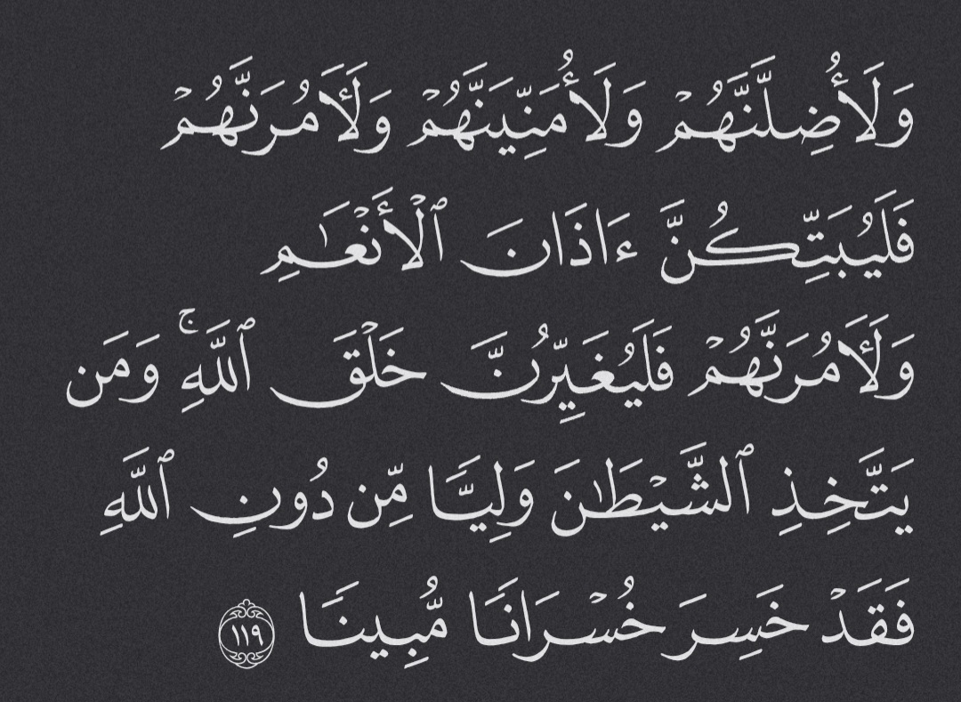 “I will certainly mislead them and delude them with empty hopes. Also, I will order them and they will slit the ears of cattle and alter Allah’s creation.” And whoever takes Satan as a guardian instead of Allah has certainly suffered a tremendous loss.”16